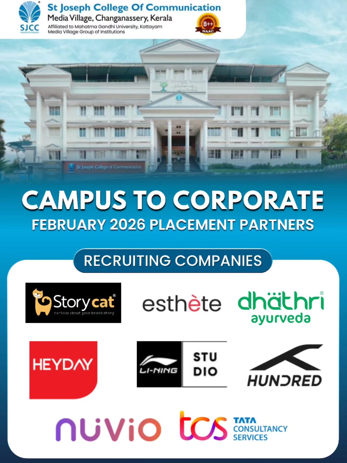 St Joseph College of Communication (SJCC), established in 2004 with the vision of "transforming media for a wholesome world" is the first university-affiliated media college in South India. SJCC is a NAAC B++ grade, self-financing college affiliated with Mahatma Gandhi University, Kottayam, and approved by the Higher Education Department, Government of Kerala. The college is under the ownership and management of the Catholic Archdiocese of Changanassery, known for overseeing reputable educational institutions such as SB College, Assumption College, and seven others, as well as more than 120 schools. SJCC pioneers media education in India, offering seven undergraduate and four postgraduate programs tailored for media-related careers. These programs cover areas such as